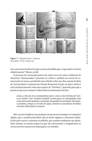 arte como uma bomba de tempo ou uma armadilha que o espectador vai ativar subjetivamente” (Romo, 2008). O processo de construção poética do artista, leva em conta a utilização de elementos “historicizados” presentes na cultura e também nos meios de comunicação de massa, permitindo uma reflexão sobre sua obra a partir da ideia de “pós-produção”, proposta por Nicolas Bourriaud (2009), na qual o artista é visto metaforicamente como uma espécie de “bricoleur”, operando para que o projeto ou processo estejam evidenciados na instauração da obra. Assim, a obra de arte contemporânea não se coloca como término do “processo criativo” (um “produto acabado” pronto para ser contemplado), mas como um local de manobra, um portal, um gerador de atividades. Bricolamse produtos, navega-se em redes de signos, inserem-se suas formas em linhas existentes (Bourriaud, 2009:16).