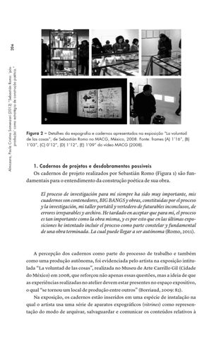Os cadernos de projeto realizados por Sebastián Romo (Figura 1) são fundamentais para o entendimento da construção poética de sua obra. El proceso de investigación para mí siempre ha sido muy importante, mis cuadernos son contenedores, BIG BANGS y obras, constituidas por el proceso y la investigación, mi taller portátil y vertedero de futurables inconclusos, de errores irreparables y archivo. He tardado en aceptar que para mí, el proceso es tan importante como la obra misma, y es por esto que en las últimas exposiciones he intentado incluir el proceso como parte constelar y fundamental de una obra terminada. La cual puede llegar a ser autónoma (Romo, 2011).