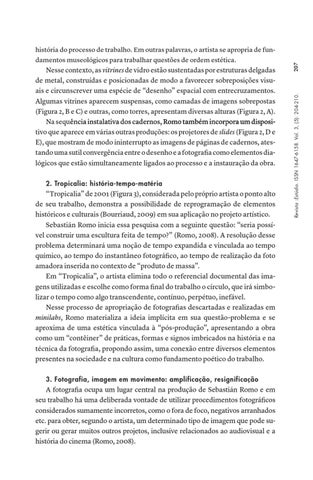 Nesse contexto, as vitrines de vidro estão sustentadas por estruturas delgadas de metal, construídas e posicionadas de modo a favorecer sobreposições visuais e circunscrever uma espécie de “desenho” espacial com entrecruzamentos. Algumas vitrines aparecem suspensas, como camadas de imagens sobrepostas (Figura 2, B e C) e outras, como torres, apresentam diversas alturas (Figura 2, A). Na sequ����������������������������������������������������������������� ência instalativa dos cadernos,���������������������������������� Romo também incorpora um dispositivo que aparece em várias outras produções: os projetores de slides (Figura 2, D e E), que mostram de modo ininterrupto as imagens de páginas de cadernos, atestando uma sutil convergência entre o desenho e a fotografia como elementos dialógicos que estão simultaneamente ligados ao processo e a instauração da obra. 2. Tropicalia: história-tempo-matéria