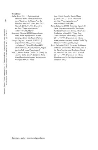 Referências Atelier Romo (2011) Depoimento de Sebastián Romo sobre seu trabalho para “Cadernos de Viagem” na 8a. Bienal do Mercosul. Vídeo. Ano: 2011. [Consult. 2012/01/05]. Disponível em: http://www.youtube.com/ watch?v=943lBGF834U Bourriaud, Nicolas (2009) Pós-produção: como a arte reprograma o mundo contemporâneo. São Paulo: Martins. Hangar.Org (s.d.) [Consult. 20111215]. Disponível em http://www.hangar. org/gallery/v/album27/album440/ album453/SR_CAT_Fot_Palabras_Pag02. jpg.html?g2_imageViewsIndex=1 MACG, Museu de Arte Carrillo Gil (2008) “La voluntad de las cosas”, Sebastian Romo + Investiduras Institucionales, Terceruquinto. Produção: MACG. Vídeo.