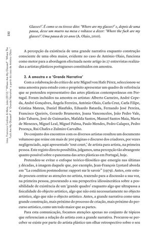 232 Lima, Francisco Cardoso & Mota, João (2012) “‘Where Are My Glasses?’ ‘Where The Fuck Are My Glasses?’ A ‘Grande Narrativa’ a partir do caso de António Olaio.”