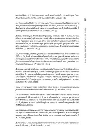 (…) tenho dificuldades em ver esse todo. Tenho muitas dificuldades em ver o meu percurso como um grande projecto. Ele não é planeado nesse sentido. (…) A estratégia não é totalmente clara nem completamente definida à partida. A estratégia vai-se construindo. (A. Ferreira, 2011); [Sobre a construção de um ‘grande quadro’,] creio que não. A menos que essa leitura [transversal] seja um processo de não-entendimento e incompreensões, como é provável que aconteça. Noto com satisfação alguma variedade nos meus trabalhos, ao mesmo tempo que verifico que aquilo que para mim constitui mudanças é visto pelos outros como manutenção de uma mesma linha de trabalho. (E. Batarda, 2011); Há pouco tempo fiz uma apresentação do meu trabalho ao doutoramento da ESBAL. No final, o Manuel Botelho veio dizer-me que a leitura e o discurso que eu produzi sobre meu trabalho tinha revelado ligações entre as diferentes fases do meu trabalho, evidenciando continuidades onde antes pareciam surgir descontinuidades. (P. Calapez, 2011); Acho que nunca trabalhei no sentido dessa tal ‘big picture’ (…) Não tenho um meio de trabalho específico. Não há uma linguagem que me possa definir ou identificar [e] o meu trabalho parecia-me um grande caos o que me provocava alguma frustração. Só agora começo a encontrar no meu percurso esse ‘grande quadro’. Consigo agora encontrar e perceber as ligações entre os meus trabalhos. (C. Cruz, 2010); Cada vez me parece mais importante olhar para os percursos individuais e percebe-los como um corpo contínuo e coerente. (P. Mendes, 2010); Sei exactamente o momento em que tomei consciência de que estava a tratar as questões de identidade. (…) A partir dessa altura, e sempre que faço um novo trabalho, relaciono-o conscientemente com as questões de identidade. (…) E julgo que os meus trabalhos giram sempre à volta dessas questões. (M. de Menezes, 2010); Há qualquer coisa que se persegue e que parece ser sempre a mesma coisa. Fazer repetidamente a mesma coisa acaba por criar algo maior. E isso acaba por ser perceptível. Em certa medida [acaba por se construir um ‘quadro maior’]. (C. Mateus, 2011); A existir essa ideia maior, ela será consequência de um somatório de momentos e de ideias (...) (Z. de Carvalho, 2011);