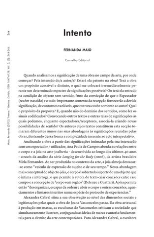 Quando analisamos a significação de uma obra no campo da arte, por onde começar? Pela intenção do/a autor/a? Estará ela patente na obra? Terá a obra um propósito acessível e distinto, o qual me colocará irremediavelmente perante um determinado espectro de significações possíveis? Ou terá ela entrado na condição de objecto sem sentido, fruto da convicção de que o Espectador (recém-nascido) e o todo-importante contexto da recepção fornecerão a devida significação, de contornos variáveis, que outrora coube somente ao autor? Qual o propósito da proposta? E, quando não do domínio dos sentidos, como ler os sinais codificados? Convocando outros textos e outras teias de significações às quais podemos, enquanto espectadores/receptores, associá-la criando novas possibilidades de sentido? Os autores cujos textos constituem esta secção tomaram diferentes rumos nas suas abordagens às significações reunidas pelas obras, ilustrando dessa forma a complexidade inerente ao acto interpretativo. Analisando a obra a partir das significações intimadas pela sua interacção com um espectador / utilizador, Ana Paula de Campos aborda as relações entre o corpo e a jóia na arte-joalheria - desenvolvida ao longo dos últimos 40 anos - através da análise da série Longing for the Body (2006), da artista brasileira Mirla Fernandes. Ao ser produzida no contexto da arte, a jóia almeja destacar-se como “veículo de expressão do sujeito e de seu tempo.” Nesta abordagem mais conceptual do objecto-jóia, o corpo é sobretudo suporte de um objecto que o intima e interroga, o que permite à autora do texto criar conexões entre esse campo e a concepção de ‘corpo sem órgãos’ (Deleuze e Guattari). A jóia permite então “desorganizar, escapar da ordem e abrir o corpo a outras conexões, agenciamentos e limiares inscritos numa espécie de protocolo de experiencias.” Alexandra Cabral situa a sua observação ao nível das dimensões sociais e legitimações pelas quais a obra de Joana Vasconcelos passa. Da obra artesanal à produção em massa, as esculturas de Vasconcelos criticam a sociedade que simultaneamente ilustram, conjugando as ideias de marca e autoria fundamentais para o circuito da arte contemporânea. Para Alexandra Cabral, a escultora
