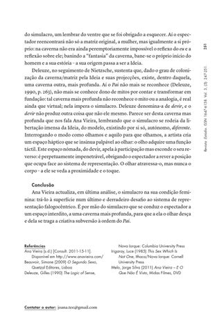 Referências Ana Vieira (s.d.) [Consult. 2011‑15‑11]. Disponível em http://www.anavieira.com/ Beauvoir, Simone (2009) O Segundo Sexo, Quetzal Editores, Lisboa Deleuze, Gilles (1990) The Logic of Sense,
