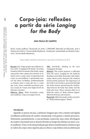 ‘Longing for the Body’ Abstract: This article proposes a reflection from the series ‘Longing for the Body,’by Brazilian artist Mirla Fernandes (São Paulo, 1969), whose poetic discusses the relations between body and jewel. The importance of the body in art jewelry is presented through the works chosen, questioning the relationship between the body that makes and the body who wear. These contents allow us to think the notion of ‘Body without Organs’ (BwO) by Deleuze and Guattari. Keywords: Mirla Fernandes, body, art-jewelry. “Body without Organs” (BwO).