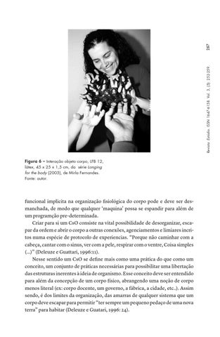 funcional implicita na organização fisiológica do corpo pode e deve ser desmanchada, de modo que qualquer ‘maquina’ possa se espandir para além de um programção pre-determinada. Criar para si um CsO consiste na vital possibilidade de desorganizar, escapar da ordem e abrir o corpo a outras conexões, agenciamentos e limiares incritos numa espécie de protocolo de experiencias. “Porque não caminhar com a cabeça, cantar com o sinus, ver com a pele, respirar com o ventre, Coisa simples (...)” (Deleuze e Guattari, 1996:11). Nesse sentido um CsO se define mais como uma prática do que como um conceito, um conjunto de práticas necessárias para possibilitar uma libertação das estruturas inerentes à ideia de organismo. Esse conceito deve ser entendido para além da concepção de um corpo físico, abrangendo uma noção de corpo menos literal (ex: corpo docente, um governo, a fábrica, a cidade, etc..). Assim sendo, é dos limites da organização, das amarras de qualquer sistema que um corpo deve escapar para permitir “ter sempre um pequeno pedaço de uma nova terra” para habitar (Deleuze e Guatari, 1996: 24).