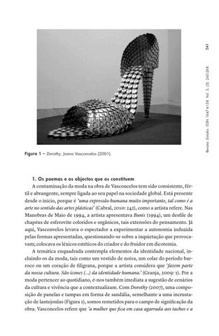 A contaminação da moda na obra de Vasconcelos tem sido consistente, fértil e abrangente, sempre ligada ao seu papel na sociedade global. Está presente desde o início, porque é ‘uma expressão humana muito importante, tal como é a arte no sentido das artes plásticas’ (Cabral, 2010: 242), como a artista refere. Nas Manobras de Maio de 1994, a artista apresentava Bunis (1994), um desfile de chapéus de esferovite coloridos e orgânicos, tais extensões do pensamento. Já aqui, Vasconvelos levava o espectador a experimentar a autonomia induzida pelas formas apresentadas, questionando-se sobre a inquietação que provocavam; colocava os léxicos estéticos do criador e do fruidor em dicotomia. A temática enquadrada contempla elementos da identidade nacional, incluindo os da moda, tais como um vestido de noiva, um colar do período barroco ou um coração de filigrana, porque a artista considera que ‘fazem parte da nossa cultura. São ícones (…) da identidade humana.’ (Granja, 2009: 1). Por a moda pertencer ao quotidiano, é-nos também imediata a sugestão de cenários da cultura e vivência que a contextualizam. Com Dorothy (2007), uma composição de panelas e tampas em forma de sandália, semelhante a uma incrustação de lantejoulas (Figura 1), somos remetidos para o campo de significação da obra. Vasconcelos refere que ‘a mulher que fica em casa agarrada aos tachos e a