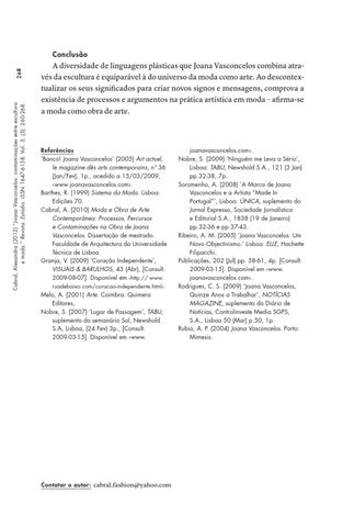 Referências ‘Banco! Joana Vasconcelos’ (2005) Art actuel, le magazine dês arts contemporains, nº 36 (Jan/Fev), 1p., acedido a 15/03/2009, ‹www.joanavasconcelos.com›. Barthes, R. (1999) Sistema da Moda. Lisboa: Edições 70. Cabral, A. (2010) Moda e Obra de Arte Contemporânea: Processos, Percursos e Contaminações na Obra de Joana Vasconcelos. Dissertação de mestrado. Faculdade de Arquitectura da Universidade Técnica de Lisboa. Granja, V. (2009) ‘Coração Independente’, VISUAIS & BARULHOS, 43 (Abr), [Consult. 2009‑08‑07]. Disponível em ‹http:// www. ruadebaixo.com/coracao-independente.html›.