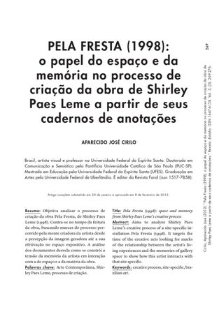 269 Cirilo, Aparecido José (2012) “‘Pela Fresta (1998): o papel do espaço e da memória no processo de criação da obra de Shirley Paes Leme a partir de seus cadernos de anotações.” Revista :Estúdio. ISSN 1647-6158. Vol. 3, (5): 269-276.