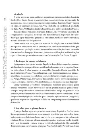 O texto apresenta uma análise de aspectos do processo criativo da artista Shirley Paes Leme. Busca-se compreender procedimentos de aproximação da memória e do espaço como matérias no projeto poético da artista. Shirley nasceu em 1955, em Cachoeira Dourada, GO. Vive e trabalha em São Paulo. É graduada em Belas Artes/UFMG; tem doutorado em Fine Arts (1986) nos Estados Unidos. A análise dos documentos de criação de Paes Leme revela uma tendência do seu processo de criação: a memória, sua, dos materiais e do público, é fio condutor que age e direciona a gênese das suas obras, mediação entre lembrança; matéria edificante do seu percurso. Desse modo, este texto, trata de aspectos da relação com a materialidade do espaço e a tendência para a construção de um discurso memorialista que determina uma produção e reflexão centradas na mediação de sua memória com a memória do espaço. Para tanto, busca-se a verificação e análise de ações e procedimentos que envolveram aspectos da instalação Pela Fresta, de 1998. 1. Do tempo, do espaço e da forma