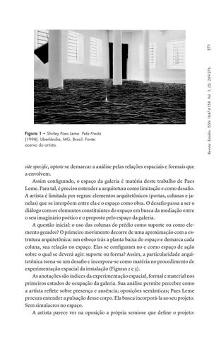 site specific, optou-se demarcar a análise pelas relações espaciais e formais que a envolvem. Assim configurado, o espaço da galeria é matéria deste trabalho de Paes Leme. Para tal, é preciso entender a arquitetura como limitação e como desafio. A artista é limitada por regras: elementos arquitetônicos (portas, colunas e janelas) que se interpõem entre ela e o espaço como obra. O desafio passa a ser o diálogo com os elementos constituintes do espaço em busca da mediação entre o seu imaginário poético e o proposto pelo espaço da galeria. A questão inicial: o uso das colunas do prédio como suporte ou como elemento gerador? O primeiro movimento decorre de uma aproximação com a estrutura arquitetônica: um esboço trás a planta baixa do espaço e demarca cada coluna, sua relação no espaço. Elas se configuram no e como espaço de ação sobre o qual se deverá agir: suporte ou forma? Assim, a particularidade arquitetônica torna-se um desafio e incorpora-se como matéria no procedimento de experimentação espacial da instalação (Figuras 2 e 3). As anotações são índices da experimentação espacial, formal e material nos primeiros estudos de ocupação da galeria. Sua análise permite perceber como a artista reflete sobre presença e ausência; oposições semânticas; Paes Leme procura entender a pulsação desse corpo. Ela busca incorporá-la ao seu projeto. Sem simulacros no espaço. A artista parece ver na oposição a própria semiose que define o projeto: