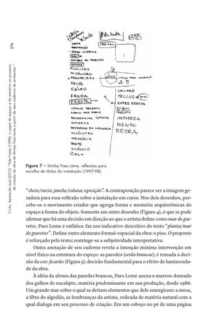 “cheio/vazio; janela/coluna; oposição”. A contraposição parece ser a imagem geradora para essa reflexão sobre a instalação em curso. Nos dois desenhos, percebe-se o movimento criador que agrega forma e memória arquitetônicas do espaço à forma do objeto. Somente em outro desenho (Figura 4), é que se pode afirmar que há uma decisão em direção ao que a artista define como mar de gravetos. Paes Leme é enfática: faz uso indicativo-descritivo do texto “planta/mar de gravetos”. Define outro elemento formal-espacial da obra: o piso. O proposto é reforçado pelo texto; restringe-se a subjetividade interpretativa. Outra anotação de seu caderno revela a intenção mínima intervenção em nivel físico na estrutura do espeço: as paredes (serão brancas); é tomada a decisão da cor: ficarão (Figura 5); decisão fundamental para o efeito de luminosidade da obra. À idéia da alvura das paredes brancas, Paes Leme anexa o marron-dourado dos galhos de eucalipto, matéria predominante em sua produção, desde 1986. Um grande mar sobre o qual se deitam elementos que dele emergiram: a mesa, a fibra do algodão, as lembranças da artista, rodeada de matéria natural com a qual dialoga em seu processo de criação. Em um esboço no pé de uma página