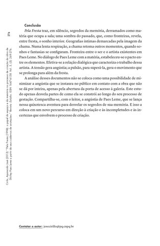 Cirilo, Aparecido José (2012) “‘Pela Fresta (1998): o papel do espaço e da memória no processo de criação da obra de Shirley Paes Leme a partir de seus cadernos de anotações.” Revista :Estúdio. ISSN 1647-6158. Vol. 3, (5): 269-276.
