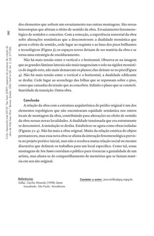 dos elementos que sofrem um esvaziamento nas outras montagens. São novas heterotopias que afetam o efeito de sentido da obra. Esvaziamento fenomenológico de sentidos e conceitos. Com a remoção, a experiência sensorial da obra sofre alterações semânticas que a desconstroem: a dualidade monástica que gerou o efeito de sentido, cede lugar ao requinte e ao luxo dos pisos brilhantes e tecnológicos (Figura 3); os espaços novos deixam de ser matéria da obra e se torna uma estratégia de emolduramento. Não há mais tensão entre o vertical e o horizontal. Observa-se na imagem que as grandes lâminas laterais não mais tangenciam o solo na rigidez monástica do ângulo reto, não mais demarcam os planos; elas deitam-se no piso(Figura 4). Não há mais tensão entre o vertical e o horizontal, a dualidade edificante se desfaz. Cede lugar ao aconchego das folhas que se repousam sobre o piso, como que cansadas da tensão que as concebeu. Infinito o plano que se constrói. Suavidade da transição. Outra obra. Conclusão