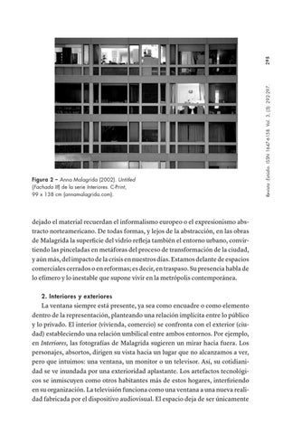 dejado el material recuerdan el informalismo europeo o el expresionismo abstracto norteamericano. De todas formas, y lejos de la abstracción, en las obras de Malagrida la superficie del vidrio refleja también el entorno urbano, convirtiendo las pinceladas en metáforas del proceso de transformación de la ciudad, y aún más, del impacto de la crisis en nuestros días. Estamos delante de espacios comerciales cerrados o en reformas; es decir, en traspaso. Su presencia habla de lo efímero y lo inestable que supone vivir en la metrópolis contemporánea. 2. Interiores y exteriores