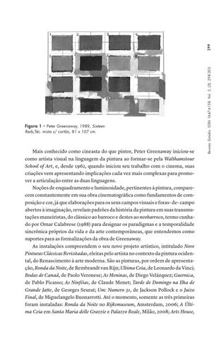 Mais conhecido como cineasta do que pintor, Peter Greenaway iniciou-se como artista visual na linguagem da pintura ao formar-se pela Walthamstour School of Art, e, desde 1962, quando iniciou seu trabalho com o cinema, suas criações vem apresentando implicações cada vez mais complexas para promover a articulação entre as duas linguagens. Noções de enquadramento e luminosidade, pertinentes à pintura, comparecem constantemente em sua obra cinematográfica como fundamentos de composição e cor, já que elaborações para os seus campos visuais e foras- de- campo abertos à imaginação, revelam padrões da história da pintura em suas transmutações maneiristas, do clássico ao barroco e destes ao neobarroco, termo cunhado por Omar Calabrese (1988) para designar os paradigmas e a temporalidade sincrônica próprios da vida e da arte contemporâneas, que entendemos como suportes para as formalizações da obra de Greenaway. As instalações compreendem o seu novo projeto artistico, intitulado Nove Pinturas Clássicas Revisitadas, eleitas pelo artista no contexto da pintura ocidental, do Renascimento à arte moderna. São as pinturas, por ordem de apresentação, Ronda da Noite, de Rembrandt van Rijn; Ultima Ceia, de Leonardo da Vinci; Bodas de Canaã, de Paolo Veronese; As Meninas, de Diego Velázquez; Guernica, de Pablo Picasso; As Ninféias, de Claude Monet; Tarde de Domingo na Ilha de Grande Jatte, de Georges Seurat; Um: Numero 31, de Jackson Pollock e o Juizo Final, de Miguelangelo Buonarrotti. Até o momento, somente as três primeiras foram instaladas: Ronda da Noite no Rijksmuseum, Amsterdam, 2006; A Última Ceia em Santa Maria delle Grazzie e Palazzo Reale, Milão, 2008; Arts House,