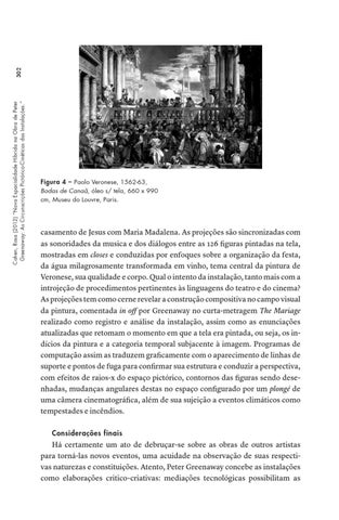 casamento de Jesus com Maria Madalena. As projeções são sincronizadas com as sonoridades da musica e dos diálogos entre as 126 figuras pintadas na tela, mostradas em closes e conduzidas por enfoques sobre a organização da festa, da água milagrosamente transformada em vinho, tema central da pintura de Veronese, sua qualidade e corpo. Qual o intento da instalação, tanto mais com a introjeção de procedimentos pertinentes às linguagens do teatro e do cinema? As projeções tem como cerne revelar a construção compositiva no campo visual da pintura, comentada in off por Greenaway no curta-metragem The Mariage realizado como registro e análise da instalação, assim como as enunciações atualizadas que retomam o momento em que a tela era pintada, ou seja, os indícios da pintura e a categoria temporal subjacente à imagem. Programas de computação assim as traduzem graficamente com o aparecimento de linhas de suporte e pontos de fuga para confirmar sua estrutura e conduzir a perspectiva, com efeitos de raios-x do espaço pictórico, contornos das figuras sendo desenhadas, mudanças angulares destas no espaço configurado por um plongé de uma câmera cinematográfica, além de sua sujeição a eventos climáticos como tempestades e incêndios. Considerações finais