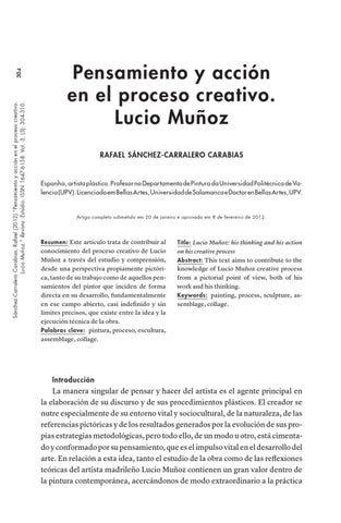 on his creative process Abstract: This text aims to contribute to the knowledge of Lucio Muñoz creative process from a pictorial point of view, both of his work and his thinking. Keywords: painting, process, sculpture, assemblage, collage.