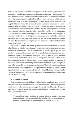 tanto en relación a las características aparenciales de las cosas, sino sobre todo de acuerdo a las fuerzas y elementos vitales que las generan y las impulsan. Por ello, Muñoz considera el tema como una fuente no sólo de información formal sino principalmente emotiva, donde las ideas y los mecanismos intelectuales y emocionales que genera el entorno son de diversa índole: literarias, musicales, arquitectónicas... También es una referencia esencial la naturaleza y, concretamente, el agua, siendo, tal como expresa el pintor, un elemento que aparece continuamente en el trasfondo de su pintura. No obstante, según evoluciona en su trayectoria artística, sus referencias y su poética estética se van reduciendo a lo fundamental, a una síntesis pictórica. Con todo, lo más relevante para él empieza y acaba siendo su diálogo con la materia, con sus cualidades plásticas y estéticas: “El material para mí es mucho más que un medio y, por supuesto, que un tema. En la materia, en la superficie, está la máxima profundidad” (Muñoz, 2006: 55) (Figuras 3 y 4). Por tanto, la pintura de Muñoz puede considerarse abstracta en cuanto al reflejo de su plástica pictórica, pero no con respecto a sus circunstancias y referencias emocionales. “Me di cuenta – dice el pintor – que lo que me interesaba de la figuración eran aspectos de la realidad que no salían en una fotografía, no estaban contenidos en la imagen” (Muñoz, 2006: 50). Una idea que describe muy bien Schneider en relación a su propia creación, al afirmar que los bosques de su tierra están presentes en sus cuadros no figurativos como lo está todo aquello que enriquece y embellece su existencia, lo que no significa que deba transcribir sus formas exteriores, pues “falsearía o desnaturalizaría enteramente el carácter propio de la expresión «abstracta»” (Lambert, 1969: 191). También, en otros términos, lo describe Henri Michaux, quien pretendía “pintar al hombre fuera de él, pintar su espacio. Lo mejor de él que está fuera de él” (Michaux, 2000: 87).