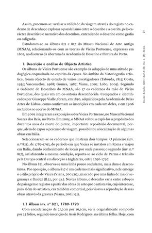 Assim, procurou-se: avaliar a utilidade da viagem através do registo no caderno de desenho; e explorar o paralelismo entre o desenho e a escrita, pelo carácter descritivo e narrativo dos desenhos, entendendo o desenho como grafia ou caligrafia. Estudaram-se os álbuns 821 e 817 do Museu Nacional de Arte Antiga (MNAA), relacionando-os com as teorias de Vieira Portuense, expressas em 1802, no discurso da abertura da Academia de Desenho e Pintura do Porto.