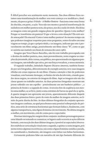 É difícil perceber seu sentimento neste momento. Nas duas últimas fotos notamos uma transformação da mulher: seu rosto começa a se modificar e, finalmente, ela parece gritar. O título – A Mulher Pantera – funciona como uma forma de elucidar, em parte, a ação. Vera não nos mostra a possível transformação da nadadora em mulher pantera nem, tão pouco, nos dá a razão do título. Ela deixa as imagens como um grande enigma pleno de questões: Quem é esta mulher? Porque se transforma em pantera? O que a levou a esta situação? Ela está sendo ameaçada? Ela atacará? Como é uma mulher pantera? Ao mesmo tempo em que podemos imaginar respostas para estas perguntas, somos levados em uma viagem no tempo, já que o próprio título, e as imagens, indicam que este é provavelmente um filme antigo, possivelmente um filme classe “B”, como os que se assistia nas matinês nos finais de semana dos anos 1960. Imagino que Vera Chaves Barcellos, não fez este trabalho preocupada com o destino da mulher pantera, mas, mais provavelmente, tenta resgatar as emoções da juventude, dela e nossa, seu público, nos apresentando em algumas poucas imagens, um trabalho que ativa, por sua força evocadora, a nossa memória. O segundo trabalho, intitulado Pequeno Discurso Amoroso, também formado por seis fotografias, diferentemente do exemplo anterior, teve suas imagens obtidas em cenas esparsas de um filme. Chama a atenção o fato de podermos visualizar, com bastante destaque, os limites da tela da televisão, criando grandes áreas negras, no entorno da imagem do filme. Aqui as imagens não são tão claras quanto no trabalho anterior. As duas primeiras fotografias mostram um jovem refletido em um espelho – possivelmente em um banheiro público –, a primeira de frente e a segunda de costas. A terceira foto da seqüência nos mostra uma mulher, ao ar livre, junto a uma estrutura de barras na qual ela se apóia. A quarta imagem nos apresenta um jovem, aparentemente diferente daquele das duas primeiras fotos e parte do rosto da mulher da imagem anterior, no limite da parte direita da foto. As duas últimas fotografias do conjunto apresentam imagens confusas, na qual percebemos uma possível sobreposição de prédios, uma série de estruturas horizontais que formam linhas e, finalmente, com alguma transparência, uma figura feminina em movimento. Na última imagem a mulher, em movimento, está de costas para o espectador. Diversas interrogações surgem deste conjunto: nenhum personagem parece estar falando ou tentando se comunicar; os lugares onde ocorrem as ações diferem bastante, com exceção das duas últimas imagens; é possível ao espectador/observador estabelecer certa relação visual entre a segunda, a quinta e a sexta imagem, pois nestas temos algumas recorrências, tais como a figura feminina sozinha e parada, ou caminhando e, finalmente, são imagens com ênfase nas linhas horizontais. Certamente podemos falar em narrativa de um tipo bastante diferente do