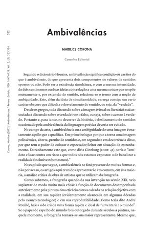 Desde os gregos, toda discussão sobre a imagem (visual ou literária) está associada à discussão sobre o verdadeiro e o falso, ou seja, sobre o acesso à verdade. Portanto e, para tanto, no decorrer da história, o deslizamento de sentidos ocasionado pela ambivalência da linguagem poética deveria ser evitado. No campo da arte, a ambivalência ou a ambiguidade de uma imagem é exatamente aquilo que a qualifica. Em primeiro lugar por que a torna uma imagem polissêmica, aberta, prenhe de sentidos e, em segundo e em decorrência disso, por que tem o poder de colocar o espectador/leitor em situação de estranhamento. Estranhamento este que, como diria Ginzburg (2001: 41), seria o “antídoto eficaz contra um risco a que todos nós estamos expostos: o de banalizar a realidade (inclusive nós mesmos).” No capítulo que segue, a ambivalência se fará presente de muitas formas e, não por acaso, os artigos aqui reunidos apresentarão em comum, em sua maioria, a análise crítica da obra de artistas que se utilizam da fotografia. Como sabemos, a fotografia quando da sua invenção no século XIX, veio suplantar de modo muito mais eficaz a função de documento desempenhada anteriormente pela pintura. Sua eficácia estava calcada na relação objetiva com a realidade, em sua rapidez (evidentemente alcançada em algumas décadas pelo avanço tecnológico) e em sua reprodutibilidade. Como teria dito André Rouillé, havia sido criada uma forma rápida e ideal de “inventariar o mundo”. Se o papel de espelho do mundo fora outorgado durante séculos à pintura, naquele momento, a fotografia tornara-se sua maior representante. Mesmo que,