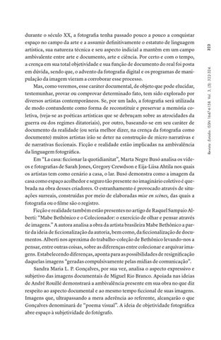 durante o século XX, a fotografia tenha passado pouco a pouco a conquistar espaço no campo da arte e a assumir definitivamente o estatuto de linguagem artística, sua natureza técnica e seu aspecto indicial a mantêm em um campo ambivalente entre arte e documento, arte e ciência. Por certo e com o tempo, a crença em sua total objetividade e sua função de documento do real foi posta em dúvida, sendo que, o advento da fotografia digital e os programas de manipulação da imagem vieram a corroborar esse processo. Mas, como veremos, esse caráter documental, de objeto que pode elucidar, testemunhar, provar ou comprovar determinado fato, tem sido explorado por diversos artistas contemporâneos. Se, por um lado, a fotografia será utilizada de modo contundente como forma de reconstituir e preservar a memória coletiva, (veja-se as poéticas artísticas que se debruçam sobre as atrocidades da guerra ou dos regimes ditatoriais), por outro, baseando-se em seu caráter de documento da realidade (ou seria melhor dizer, na crença da fotografia como documento) muitos artistas irão se deter na construção de micro narrativas e de narrativas ficcionais. Ficção e realidade estão implicadas na ambivalência da linguagem fotográfica. Em “La casa: ficcionar la quotidianitat”, Marta Negre Busó analisa os vídeos e fotografias de Sarah Jones, Gregory Crewdson e Eija-Liisa Ahtila nos quais os artistas tem como cenário a casa, o lar. Busó demonstra como a imagem da casa como espaço acolhedor e seguro tão presente no imaginário coletivo é quebrada na obra desses criadores. O estranhamento é provocado através de situações surreais, construídas por meio de elaboradas mise en scènes, das quais a fotografia ou o filme são o registro. Ficção e realidade também estão presentes no artigo de Raquel Sampaio Alberti: “Mabe Bethônico e o Colecionador: o exercício de olhar e pensar através de imagens.” A autora analisa a obra da artista brasileira Mabe Bethônico a partir da ideia de ficcionalização da autoria, bem como, da ficcionalização de documentos. Alberti nos aproxima do trabalho-coleção de Bethônico levando-nos a pensar, entre outras coisas, sobre as diferenças entre colecionar e arquivar imagens. Estabelecendo diferenças, aponta para as possibilidades de resignificação daquelas imagens “geradas compulsivamente pelas mídias de comunicação”. Sandra Maria L. P. Gonçalves, por sua vez, analisa o aspecto expressivo e subjetivo das imagens documentais de Miguel Rio Branco. Apoiada nas ideias de André Rouillé demonstrará a ambivalência presente em sua obra no que diz respeito ao aspecto documental e ao mesmo tempo ficcional de suas imagens. Imagens que, ultrapassando a mera aderência ao referente, alcançarão o que Gonçalves denominará de “poema visual”. A ideia de objetividade fotográfica abre espaço à subjetividade do fotógrafo.