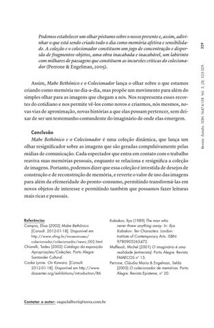 Kabakov, Ilya (1989) The man who never threw anything away. In: Ilya Kabakov: Ten Characters. London: Institute of Contemporary Arts. ISBN: 9780905263472. Maffesoli, Michel (2001) O imaginário é uma realidade (entrevista). Porto Alegre: Revista FAMECOS nº 15. Perrone, Cláudia Maria & Engelman, Selda (2005) O colecionador de memórias. Porto Alegre: Revista Episteme, nº 20.