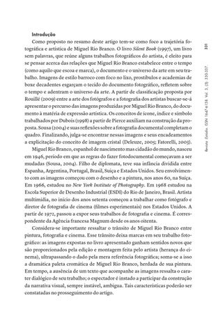 Como proposto no resumo deste artigo tem-se como foco a trajetória fotográfica e artística de Miguel Rio Branco. O livro Silent Book (1997), um livro sem palavras, que reúne alguns trabalhos fotográficos do artista, é eleito para se pensar acerca das relações que Miguel Rio Branco estabelece entre o tempo (como aquilo que escoa e marca), o documento e o universo da arte em seu trabalho. Imagens de estilo barroco com foco no lixo, prostíbulos e academias de boxe decadentes esgarçam o tecido do documento fotográfico, refletem sobre o tempo e adentram o universo da arte. A partir de classificação proposta por Rouillé (2009) entre a arte dos fotógrafos e a fotografia dos artistas buscar-se-á apresentar o percurso das imagens produzidas por Miguel Rio Branco, do documento à matéria de expressão artística. Os conceitos de ícone, índice e símbolo trabalhados por Dubois (1998) a partir de Pierce auxiliam na construção da proposta. Sousa (2004) e suas reflexões sobre a fotografia documental completam o quadro. Finalizando, julga-se encontrar nessas imagens e seus encadeamentos a explicitação do conceito de imagem cristal (Deleuze, 2005; Fatorelli, 2003). Miguel Rio Branco, espanhol de nascimento mas cidadão do mundo, nasceu em 1946, período em que as regras do fazer fotodocumental começavam a ser mudadas (Sousa, 2004). Filho de diplomata, teve sua infância dividida entre Espanha, Argentina, Portugal, Brasil, Suiça e Estados Unidos. Seu envolvimento com as imagens começou com o desenho e a pintura, nos anos 60, na Suíça. Em 1966, estudou no New York Institute of Photography. Em 1968 estudou na Escola Superior de Desenho Industrial (ESDI) do Rio de Janeiro, Brasil. Artista multimídia, no início dos anos setenta começou a trabalhar como fotógrafo e diretor de fotografia de cinema (filmes esperimentais) nos Estados Unidos. A partir de 1972, passou a expor seus trabalhos de fotografia e cinema. É correspondente da Agência francesa Magnum desde os anos oitenta. Considera-se importante ressaltar o trânsito de Miguel Rio Branco entre pintura, fotografia e cinema. Esse trânsito deixa marcas em seu trabalho fotográfico: as imagens expostas no livro apresentado ganham sentidos novos que são proporcionados pela edição e montagem feita pelo artista (herança do cinema), ultrapassando o dado pela mera referência fotográfica; soma-se a isso a dramática paleta cromática de Miguel Rio Branco, herdada de sua pintura. Em tempo, a ausência de um texto que acompanhe as imagens ressalta o carater dialógico de seu trabalho; o espectador é instado a participar da construção da narrativa visual, sempre instável, ambigua. Tais características poderão ser constatadas no prosseguimento do artigo.