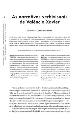 ro Valêncio Xavier Niculitcheff (SãoPaulo,1933), destacando sua excelência conceitual, a habilidade construtiva e a capacidade de aliciamento de sua obra híbrida, que articula, com maestria e habilidade, características como a narrabilidade, a ficcionalização e o documental, inserindo-o na tradição de artistas/autores que articulam literatura e artes visuais em narrativas que podemos classificar como verbivisuais. Palavras chave: Valêncio Xavier, narrativa visual, arte contemporânea.