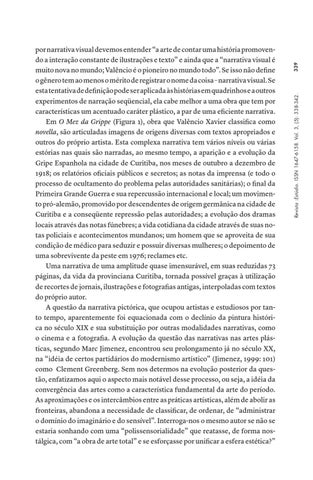 por narrativa visual devemos entender “a arte de contar uma história promovendo a interação constante de ilustrações e texto” e ainda que a “narrativa visual é muito nova no mundo; Valêncio é o pioneiro no mundo todo”. Se isso não define o gênero tem ao menos o mérito de registrar o nome da coisa – narrativa visual. Se esta tentativa de definição pode ser aplicada às histórias em quadrinhos e a outros experimentos de narração seqüencial, ela cabe melhor a uma obra que tem por características um acentuado caráter plástico, a par de uma eficiente narrativa. Em O Mez da Grippe (Figura 1), obra que Valêncio Xavier classifica como novella, são articuladas imagens de origens diversas com textos apropriados e outros do próprio artista. Esta complexa narrativa tem vários níveis ou várias estórias nas quais são narradas, ao mesmo tempo, a aparição e a evolução da Gripe Espanhola na cidade de Curitiba, nos meses de outubro a dezembro de 1918; os relatórios oficiais públicos e secretos; as notas da imprensa (e todo o processo de ocultamento do problema pelas autoridades sanitárias); o final da Primeira Grande Guerra e sua repercussão internacional e local; um movimento pró-alemão, promovido por descendentes de origem germânica na cidade de Curitiba e a conseqüente repressão pelas autoridades; a evolução dos dramas locais através das notas fúnebres; a vida cotidiana da cidade através de suas notas policiais e acontecimentos mundanos; um homem que se aproveita de sua condição de médico para seduzir e possuir diversas mulheres; o depoimento de uma sobrevivente da peste em 1976; reclames etc. Uma narrativa de uma amplitude quase imensurável, em suas reduzidas 73 páginas, da vida da provinciana Curitiba, tornada possível graças à utilização de recortes de jornais, ilustrações e fotografias antigas, interpoladas com textos do próprio autor. A questão da narrativa pictórica, que ocupou artistas e estudiosos por tanto tempo, aparentemente foi equacionada com o declínio da pintura histórica no século XIX e sua substituição por outras modalidades narrativas, como o cinema e a fotografia. A evolução da questão das narrativas nas artes plásticas, segundo Marc Jimenez, encontrou seu prolongamento já no século XX, na “idéia de certos partidários do modernismo artístico” (Jimenez, 1999: 101) como Clement Greenberg. Sem nos determos na evolução posterior da questão, enfatizamos aqui o aspecto mais notável desse processo, ou seja, a idéia da convergência das artes como a característica fundamental da arte do período. As aproximações e os intercâmbios entre as práticas artísticas, além de abolir as fronteiras, abandona a necessidade de classificar, de ordenar, de “administrar o domínio do imaginário e do sensível”. Interroga-nos o mesmo autor se não se estaria sonhando com uma “polissensorialidade” que reatasse, de forma nostálgica, com “a obra de arte total” e se esforçasse por unificar a esfera estética?”