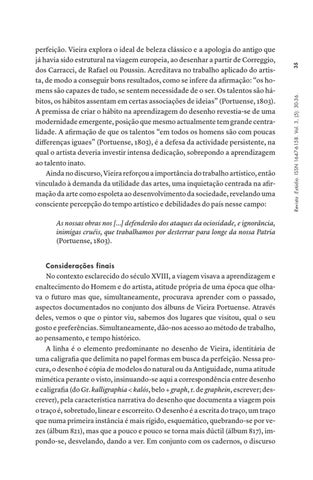 As nossas obras nos […] defenderão dos ataques da ociosidade, e ignorância, inimigas cruéis, que trabalhamos por desterrar para longe da nossa Patria (Portuense, 1803). Considerações finais No contexto esclarecido do século XVIII, a viagem visava a aprendizagem e enaltecimento do Homem e do artista, atitude própria de uma época que olhava o futuro mas que, simultaneamente, procurava aprender com o passado, aspectos documentados no conjunto dos álbuns de Vieira Portuense. Através deles, vemos o que o pintor viu, sabemos dos lugares que visitou, qual o seu gosto e preferências. Simultaneamente, dão-nos acesso ao método de trabalho, ao pensamento, e tempo histórico. A linha é o elemento predominante no desenho de Vieira, identitária de uma caligrafia que delimita no papel formas em busca da perfeição. Nessa procura, o desenho é cópia de modelos do natural ou da Antiguidade, numa atitude mimética perante o visto, insinuando-se aqui a correspondência entre desenho e caligrafia (do Gr. kalligraphia < kalós, belo + graph, r. de graphein, escrever; descrever), pela característica narrativa do desenho que documenta a viagem pois o traço é, sobretudo, linear e escorreito. O desenho é a escrita do traço, um traço que numa primeira instância é mais rígido, esquemático, quebrando-se por vezes (álbum 821), mas que a pouco e pouco se torna mais dúctil (álbum 817), impondo-se, desvelando, dando a ver. Em conjunto com os cadernos, o discurso