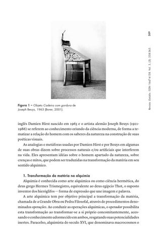 inglês Damien Hirst nascido em 1965 e o artista alemão Joseph Beuys (19211986) se referem ao conhecimento oriundo da ciência moderna, de forma a tematizar a relação do homem com os saberes da natureza na construção de suas poéticas visuais. As analogias e metáforas usadas por Damien Hirst e por Beuys em algumas de suas obras dizem sobre processos naturais e/ou artificiais que interferem na vida. Eles apresentam idéias sobre o homem apartado da natureza, sobre crenças e mitos, que podem ser traduzidas na transformação da matéria em seu sentido alquímico. 1. Transformação da matéria na alquimia