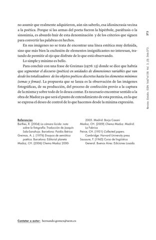 Referencias Barthes, R. (2004) La cámara lúcida: nota sobre la fotografía. Traducción de Joaquín Sala-Sanahuja. Barcelona: Paidós Ibérica Greimas, A. J. (1976) Ensayos de semiótica poética. Barcelona: Editorial planeta Madoz, CH. (2006) Chema Madoz 2000-