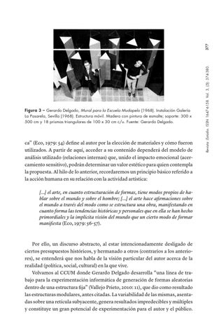 ca” (Eco, 1979: 54) define al autor por la elección de materiales y cómo fueron utilizados. A partir de aquí, acceder a su contenido dependerá del modelo de análisis utilizado (relaciones internas) que, unido el impacto emocional (acercamiento sensitivo), podrán determinar un valor estético para quien contempla la propuesta. Al hilo de lo anterior, recordaremos un principio básico referido a la acción humana en su relación con la actividad artística: […] el arte, en cuanto estructuración de formas, tiene modos propios de hablar sobre el mundo y sobre el hombre; […] el arte hace afirmaciones sobre el mundo a través del modo como se estructura una obra, manifestando en cuanto forma las tendencias históricas y personales que en ella se han hecho primordiales y la implícita visión del mundo que un cierto modo de formar manifiesta (Eco, 1979: 56-57).