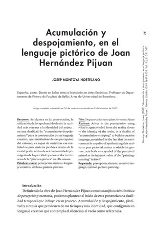 381 Montoya Hortelano, Josep (2012) “Acumulación y despojamiento, en el lenguaje pictórico de Joan Hernández Pijuan.” Revista :Estúdio. ISSN 1647-6158. Vol. 3, (5): 381-387.