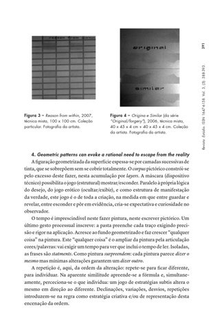 A figuração geometrizada da superfície espessa-se por camadas sucessivas de tinta, que se sobrepõem sem se cobrir totalmente. O corpus pictórico constrói-se pelo excesso deste fazer, nesta acumulação por layers. A máscara (dispositivo técnico) possibilita o jogo (estrutural) mostrar/esconder. Paralelo à própria lógica do desejo, do jogo erótico (ocultar/exibir), e como estrutura de manifestação da verdade, este jogo é o de toda a criação, na medida em que entre guardar e revelar, entre esconder e pôr em evidência, cria-se expectativa e curiosidade no observador. O tempo é imprescindível neste fazer pintura, neste escrever pictórico. Um último gesto processual inscreve: a pasta preenche cada traço exigindo precisão e rigor na aplicação. Acresce ao fundo geometrizado e faz crescer “qualquer coisa” na pintura. Este “qualquer coisa” é o ampliar da pintura pela articulação cores/palavras: vai exigir um tempo para ver que inclui o tempo de ler. Isoladas, as frases são statments. Como pintura surpreendem: cada pintura parece dizer o mesmo mas mínimas alterações garantem um dizer outro. A repetição é, aqui, da ordem da alteração: repete-se para ficar diferente, para individuar. Na aparente similitude apreende-se a fórmula e, simultaneamente, perceciona-se o que individua: um jogo de estratégias subtis altera o mesmo em direção ao diferente. Declinações, variações, desvios, repetições introduzem-se na regra como estratégia criativa e/ou de representação desta encenação da ordem.