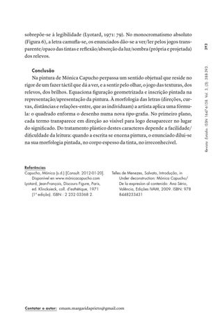 sobrepõe-se à legibilidade (Lyotard, 1971: 79). No monocromatismo absoluto (Figura 6), a letra camufla-se, os enunciados dão-se a ver/ler pelos jogos transparente/opaco das tintas e reflexão/absorção da luz/sombra (própria e projetada) dos relevos.
