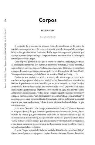 396 Serra, J. Paulo (2012) “Corpos.” Revista :Estúdio. ISSN 1647-6158. Vol. 3, (5): 396-397.