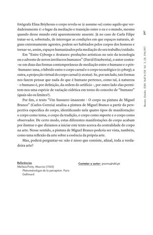 fotógrafa Elina Briyhesus o corpo revela-se (e assume-se) como aquilo que verdadeiramente é: o lugar da mediação e transição entre o eu e o mundo, mesmo quando desse mundo está aparentemente ausente. Já no caso de Carla Filipe tratar-se-á, sobretudo, de interrogar as condições em que espaços naturais, alguns extremamente agrestes, podem ser habitados pelos corpos dos homens e tornar-se, assim, espaços humanizados pela mediação do seu trabalho/cuidado. Em “Entre Cyborgs e Avatares: produções artísticas no seio da tecnologia ou o advento de novos invólucros humanos” (David Etxeberria), o autor centra-se em duas das formas contemporâneas de mediação entre o humano e o pós-humano: uma, o híbrido entre o corpo carnal e o corpo tecnológico (o cyborg); a outra, a projecção virtual do corpo carnal (o avatar). Se, por um lado, tais formas nos fazem pensar que nada do que é humano pertence, como tal, à natureza – o humano é, por definição, da ordem do artifício -, por outro lado elas permitem-nos uma espécie de variação eidética em torno do conceito de “humano” (quais são os limites?). Por fim, o texto “Um Sussurro imanente - O corpo na pintura de Miguel Branco” (Carlos Correia) analisa a pintura de Miguel Branco a partir da perspectiva específica do corpo, identificando nela quatro tipos de manifestação: o corpo como tema, o corpo da tradição, o corpo como suporte e o corpo como observador. De certo modo, estas diferentes manifestações do corpo acabam por ilustrar o que dizíamos a iniciar este texto acerca da centralidade do corpo na arte. Nesse sentido, a pintura de Miguel Branco poderia ser vista, também, como uma reflexão da arte sobre a essência da própria arte. Mas, poderá perguntar-se: não é nisso que consiste, afinal, toda a verdadeira arte?