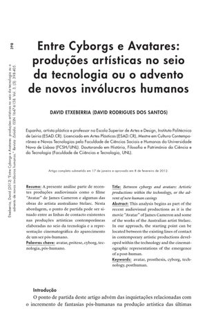 tes produções audiovisuais como o filme “Avatar” de James Cameron e algumas das obras do artista australiano Stelarc. Nesta abordagem, o ponto de partida pode ser situado entre as linhas de contacto existentes nas produções artísticas contemporâneas elaboradas no seio da tecnologia e a representação cinematográfica do aparecimento de um ser pós-humano. Palavras chave: avatar, prótese, cyborg, tecnologia, pós-humano.