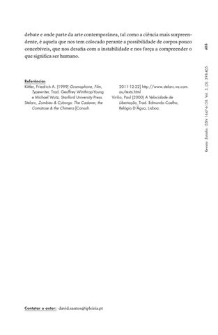 Referências Kittler, Friedrich A. (1999) Gramophone, Film, Typewriter, Trad. Geoffrey Winthrop-Young e Michael Wutz, Stanford University Press. Stelarc, Zombies & Cyborgs: The Cadaver, the Comatose & the Chimera [Consult.