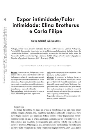 Brotherus and Carla Filipe Abstract: It promotes a dialogue between the work of two artists, specifically about pieces that result from life experiences and have different ways of ‘saying’ intimacy. The presentation is divided into two parts where the understanding of identity is observed through the self-referential discourse of each one—exposing and speaking. Keywords: intimacy, self-representation, otherness, course, spectator.