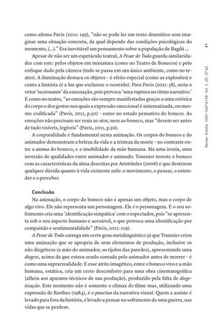 como afirma Pavis (2011: 195), “não se pode ler um texto dramático sem imaginar uma situação concreta, da qual depende das condições psicológicas do momento, (...).” Era inevitável um pensamento sobre a população de Bagdá ... Apesar de não ser um espetáculo teatral, A Pesar de Todo guarda similaridades com este: pelos objetos em miniatura (como no Teatro de Bonecos) e pelo enfoque dado pela câmera (tudo se passa em um único ambiente, como no teatro). A iluminação destaca os objetos – é efeito especial (como as explosões) e conta a história (é a luz que esclarece o ocorrido). Para Pavis (2011: 58), seria o vetor ‘secionante’ da encenação, pois provoca ‘uma ruptura no ritmo narrativo.’ E como no teatro, “as emoções são sempre manifestadas graças a uma retórica do corpo e dos gestos nos quais a expressão emocional é sistematizada, ou mesmo codificada” (Pavis, 2011, p.50) – como no estado pensativo do boneco. As emoções não precisam ser reais ao ator, nem ao boneco, mas “devem ser antes de tudo visíveis, legíveis” (Pavis, 2011, p.50). A corporalidade é fundamental nesta animação. Os corpos do boneco e do animador demonstram a beleza da vida e a tristeza da morte – no contraste entre a anima do boneco, e a imobilidade da mão humana. Há uma ironia, uma inversão de qualidades entre animador e animado. Tournier investe o boneco com as características da alma descritas por Aristóteles (2006) e que destróem qualquer dúvida quanto à vida existente nele: o movimento, o pensar, o entender e o perceber.