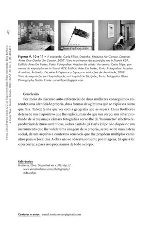 412 Neves, Sónia Patrícia Inácio (2012) “Expor intimidade/Falar intimidade: Elina Brotherus e Carla Filipe.” Revista :Estúdio. ISSN 1647-6158. Vol. 3, (5): 406-412.