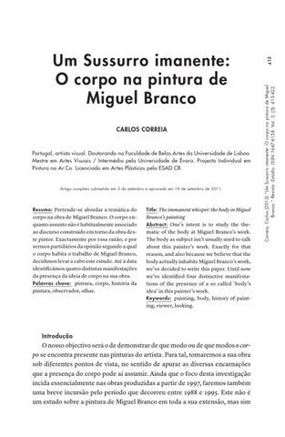 413 Correia, Carlos (2012) “Um Sussurro imanente: O corpo na pintura de Miguel Branco.” Revista :Estúdio. ISSN 1647-6158. Vol. 3, (5): 413-422.