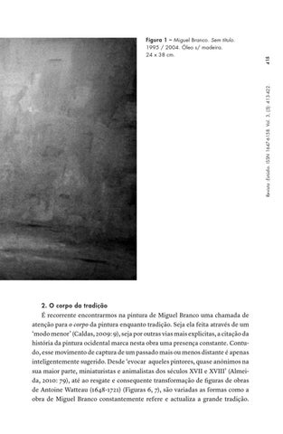 É recorrente encontrarmos na pintura de Miguel Branco uma chamada de atenção para o corpo da pintura enquanto tradição. Seja ela feita através de um ‘modo menor’ (Caldas, 2009: 9), seja por outras vias mais explicitas, a citação da história da pintura ocidental marca nesta obra uma presença constante. Contudo, esse movimento de captura de um passado mais ou menos distante é apenas inteligentemente sugerido. Desde ‘evocar aqueles pintores, quase anónimos na sua maior parte, miniaturistas e animalistas dos séculos XVII e XVIII’ (Almeida, 2010: 79), até ao resgate e consequente transformação de figuras de obras de Antoine Watteau (1648-1721) (Figuras 6, 7), são variadas as formas como a obra de Miguel Branco constantemente refere e actualiza a grande tradição.