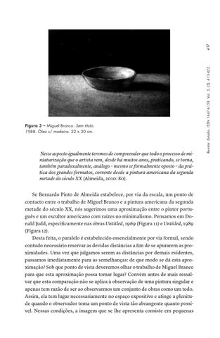 Nesse aspecto igualmente teremos de compreender que todo o processo de miniaturização que o artista vem, desde há muitos anos, praticando, se torna, também paradoxalmente, análogo – mesmo se formalmente oposto – da prática dos grandes formatos, corrente desde a pintura americana da segunda metade do século XX (Almeida, 2010: 80). Se Bernardo Pinto de Almeida estabelece, por via da escala, um ponto de contacto entre o trabalho de Miguel Branco e a pintura americana da segunda metade do século XX, nós sugerimos uma aproximação entre o pintor português e um escultor americano com raízes no minimalismo. Pensamos em Donald Judd, especificamente nas obras Untitled, 1969 (Figura 11) e Untitled, 1989 (Figura 12). Desta feita, o paralelo é estabelecido essencialmente por via formal, sendo contudo necessário reservar as devidas distâncias a fim de se apurarem as proximidades. Uma vez que julgamos serem as distâncias por demais evidentes, passamos imediatamente para as semelhanças: de que modo se dá esta aproximação? Sob que ponto de vista deveremos olhar o trabalho de Miguel Branco para que esta aproximação possa tomar lugar? Convém antes de mais ressalvar que esta comparação não se aplica à observação de uma pintura singular e apenas tem razão de ser ao observarmos um conjunto de obras como um todo. Assim, ela tem lugar necessariamente no espaço expositivo e atinge a plenitude quando o observador toma um ponto de vista tão abrangente quanto possível. Nessas condições, a imagem que se lhe apresenta consiste em pequenas
