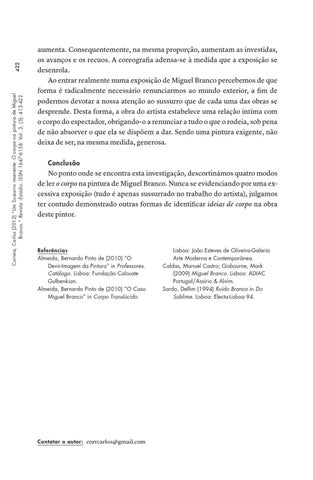 422 Correia, Carlos (2012) “Um Sussurro imanente: O corpo na pintura de Miguel Branco.” Revista :Estúdio. ISSN 1647-6158. Vol. 3, (5): 413-422.