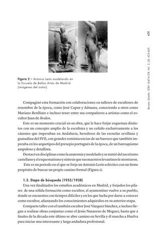 Compaginó esta formación con colaboraciones en talleres de escultores de renombre de la época, como José Capuz y Adsuara, conociendo a otros como Mariano Benlliure e incluso tener entre sus compañeros a artistas como el escultor Juan de Ávalos. Este es un momento crucial en su obra, que le hace forjar esquemas distintos con un concepto amplio de la escultura y no ceñido exclusivamente a los cánones que imperaban en Andalucía, herederos de las escuelas sevillana y granadina del SVII, con grandes reminiscencias de un barroco que también imperaba en los arquetipos del presepio portugués de la época, de un barroquismo ampuloso y detallista. Destacó en disciplinas como la anatomía y modelado y se nutrió del ascetismo castellano y el esquematismo y síntesis que sus maestros levantinos le mostraron. Este es un periodo en el que se forja un Antonio León ecléctico con un firme propósito de buscar un propio camino formal (Figura 2). 1.3. Etapa de búsqueda (1933/1938)